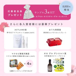 (総額 8,000 円相当、それぞれ約1週間分) - 入賞者の方には、季令全アイテムセット(44,500円相当)など (上記画像をご参照ください)
