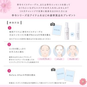 - ご使用前後の画像を送ってくださった方に「季令エラスチンカプセル」「季令モイスチャーゲル」「季令エッセンス」のサンプル3点セット